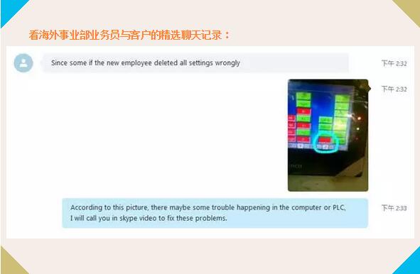 印度客戶,于2013年從派克購買數(shù)控清角機。近日,由于新員工誤操作,導致設備運行出現(xiàn)問題。客戶從印度那邊發(fā)過來求助信息,海外事業(yè)部的業(yè)務員通過Skype與該客戶取得聯(lián)系,進一步了解設備故障出現(xiàn)的原因,故障出現(xiàn)時呈現(xiàn)的狀態(tài)等,再與技術工程師溝通交流,了解可能導致的原因以及用對措施,通過圖片、視頻,在線視頻等途徑進行跨國通話,最終發(fā)現(xiàn)問題出現(xiàn)在數(shù)控系統(tǒng)之中。于是,技術部和售后服務部齊心協(xié)力將解決方案以圖片以及視頻的方式多元素,多途徑展示給客戶,指導客戶如何編程,并編寫一套代碼數(shù)據(jù)發(fā)送過去,最終該清角機一切數(shù)據(jù)恢復正常,六把刀又重新正常流利工作(客戶與海外事業(yè)部業(yè)務員部分聊天記錄)